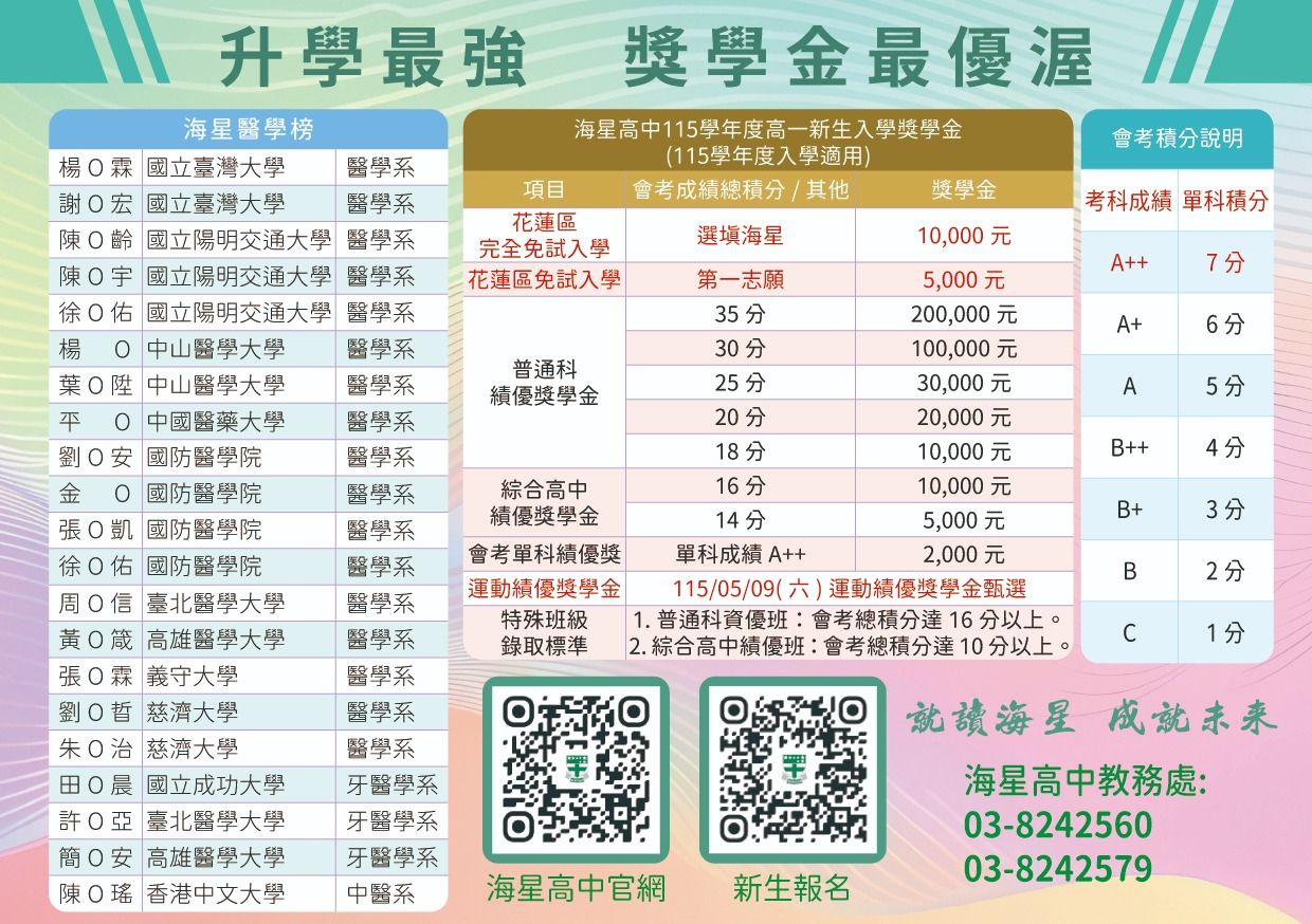 ![]() 海星A5招生手冊 13797K 115/3/2 | ![]() 海星高中-榜單-反 520K 115/3/2 | ![]() 海星高中-榜單-正 454K 115/3/2 | ![]() 海星高中-禮包卡-反 238K 115/3/2 |